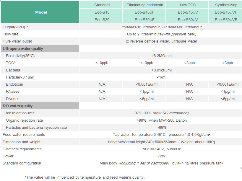With LCD controlling system, 2-way water quality sensors, timing and quality dispensing, single stage RO system, 1 pump, and built-in 12 litres tank, Eco-S series ultrapure water system is economic choice of ultrapure water for high grade experiments. With tap water inlet, its output ranges from 15 to 30 litres/hour. It can produce single stage RO water and ultrapure water. The single stage RO water’s ion rejection rate is more than 97%, and the ultrapure water’s resistivity absolutely reaches to 18.2MΩ.cm. It completely meets the highest grade I standard of ASTM, CAP, CLSI, EP and USP.